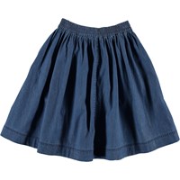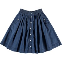 Bolette ist ein blauer Medi-Jeansrock mit Knopfverschluss und Fronttaschen. Der Rock hat eine elastische Taille, die eine gute Passform bietet.