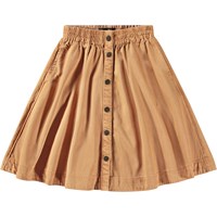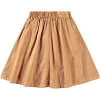 Brauner knielanger Rock aus weicher Baumwolle und Viskosemischung. Der Rock hat einen elastischen Bund, seitliche Taschen und kupferfarbene Druckknöpfe auf der Vorderseite. Der Rock ist in einer kreisförmigen Form geschnitten und fällt wunderschön und schwer.