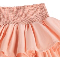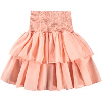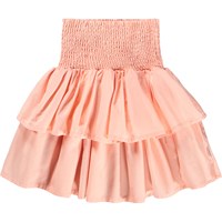 Pfirsichfarbener, knielanger Rock aus weicher Öko-Baumwolle, mit einem breiten Smok am Bund, der eine flexible Passform gewährleistet und das Anziehen erleichtert. Der Rock besteht aus zwei Stofflagen, die ihm ein schönes Volumen und ein leichtes, lebendiges Aussehen verleihen.