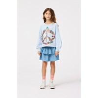 Blauer knielanger Rock aus Öko-Baumwoll-Chambray. Der Rock hat einen breiten Bund, der mit Rüschen genäht ist, und einen voluminösen Rock in 2 Lagen. Der elastische Bund macht es einfach anzuziehen und angenehm zu tragen.