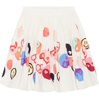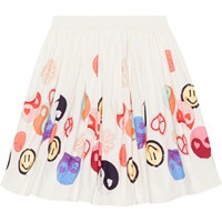 Cremefarbener Rock aus Öko-Baumwollpopeline. Der Rock hat vorne eine feste Taille, hinten ist er elastisch, sodass er leicht anzuziehen ist. Der Rock ist rund geschnitten und wird um die Taille herum gerafft. Der Aufdruck der Yin- und Yang-Aufkleber folgt dem Rock rundherum.
