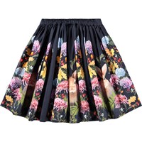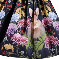 Dunkelblauer knielanger Rock aus Öko-Baumwolle mit einem Blumen- und Hasenmuster. Der Rock hat einen festen Bund vorne und ist hinten elastisch, um das Anziehen zu erleichtern und einen bequemen Sitz zu gewährleisten. Der Rock ist in der Taille gerafft und verleiht ihm ein schönes Volumen.