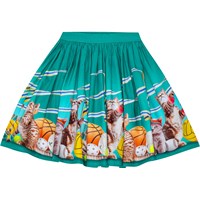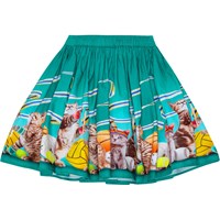 Petrolgrüner knielanger Baumwollrock. Der Rock hat einen festen Bund vorne, während er hinten elastisch ist, was das Anziehen erleichtert und angenehm zu tragen ist. Der Rock sammelt sich um die Taille und verleiht ihm ein schönes Volumen. Das Muster zeigt Kätzchen in Sportbekleidung, umgeben von Bällen, und vermittelt die Botschaft, wie Sport und Spiel unsere Freundschaften und Beziehungen bereichern können.