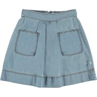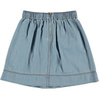 Bonnie ist ein blauer Jeansrock mit Fronttaschen. Der Rock wird auf der Rückseite mit einem Reißverschluss verschlossen.