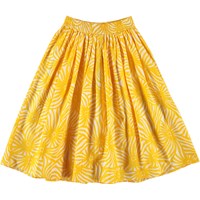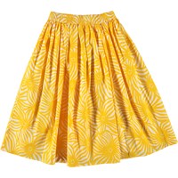 Bree ist ein sonnengelber Midirock aus Öko-Baumwolle mit einem abstrakten Talover-Print mit lächelnden Sonnen.