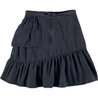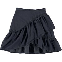 Breena ist ein dunkelblauer Jeansrock mit Wickeleffekt und schräger Rüschenkante. Der Rock wird hinten mit einem Reißverschluss geschlossen.