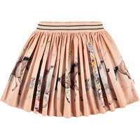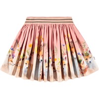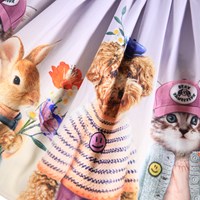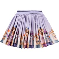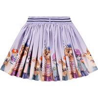 Lila kreisförmiger Rock aus Öko-Baumwolle. Der Rock ist bequem und einfach anzuziehen mit dem elastischen gestreiften Bund. Der Rock hat einen Aufdruck von Tieren, die Kleidung tragen.