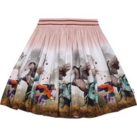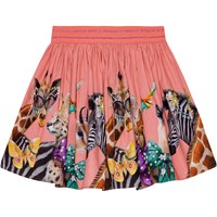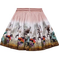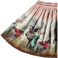 Rosa A-Linien-Rock aus Öko-Baumwolle. Der Rock ist bequem und einfach anzuziehen dank seines elastischen gestreiften Bundes. Der Rock hat ein Muster aus fantasievollen und bunten Leopardenpferden, grünen Zebras und regenbogenfarbenen geflügelten Pferden.