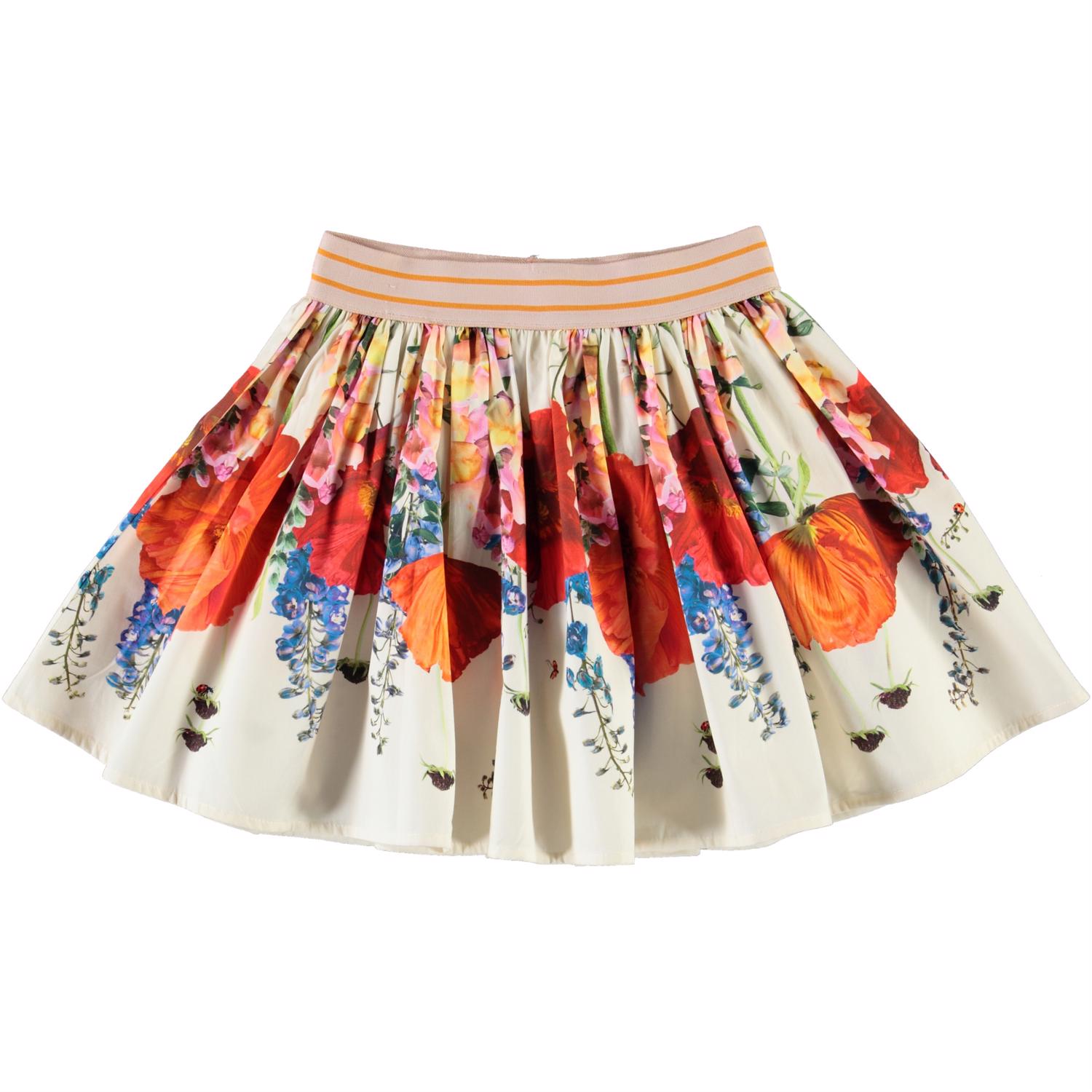 Brenda ist ein leichter Baumwollrock mit schönem Blumendruck und gestreifter elastischer Taille in rosa und orange. Ecocert Greenlife, certifikationsnr. 197496