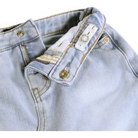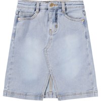 Hellblauer Jeansrock aus Öko-Baumwolle mit offenem Schlitz vorne. Der Rock hat eine klassische A-Linien-Form, Taschen vorne und hinten sowie Druckknopfverschluss bis Größe 140. Es gibt einen internen verstellbaren Gummizug in der Taille, sodass die Passform leicht angepasst werden kann.