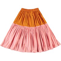 Bridget ist ein langer plissierter Rock, wo der oberen Teil orange ist, während der Rest des Rocks rosa ist. Der Rock hat eine elastische Taille die eine gute Passform sichert