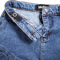 Blauer Jeansrock mit einer Rüsche am Saum. Der Rock ist knielang und hat sowohl vorne als auch hinten Taschen. Er hat einen Reißverschluss und einen Druckknopfverschluss sowie Gürtelschlaufen. Der Bund hat ein internes verstellbares Gummiband, damit er für die richtige Passform angepasst werden kann.