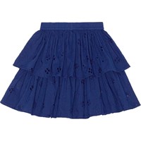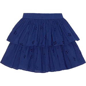 Dunkelblauer Broderie-Anglaise-Rock aus Öko-Baumwolle. Der Rock ist mittellang und besteht aus zwei unterschiedlich langen Röcken und einem Gummizug in der Taille, der für ein angenehmes Tragegefühl sorgt.