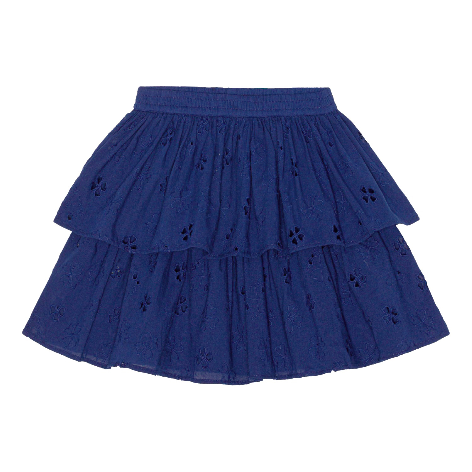 Dunkelblauer Broderie-Anglaise-Rock aus Öko-Baumwolle. Der Rock ist mittellang und besteht aus zwei unterschiedlich langen Röcken und einem Gummizug in der Taille, der für ein angenehmes Tragegefühl sorgt.