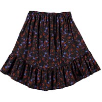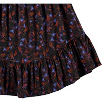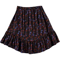 Brina ist ein dunkler Rock mit einem Aufdruck von blauen Blüten mit roten Blättern. Der Rock hat unten eine Rüschenkante und seitlich einen Reißverschluss.