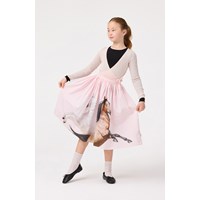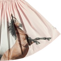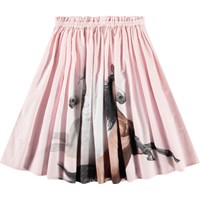 Rosa knielanger Rock aus Öko-Baumwolle. Der Rock hat einen festen Bund vorne, während er hinten elastisch ist für einfaches Anziehen. Der Rock ist kreisförmig und sammelt sich um die Taille. Er hat einen großen Pferdedruck.