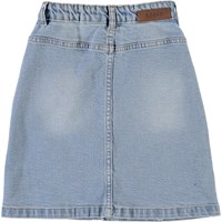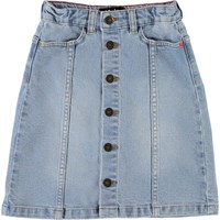 Britney ist ein Denim-Rock mit Knopfverschluss auf der Vorderseite. Der Rock hat Gürtelschlaufen und Taschen auf der Vorderseite.
