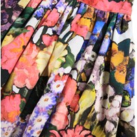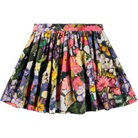Bunter Rock aus Baumwoll-Viskose mit Blumenmuster. Der Rock ist knielang mit einem vorderen festen und hinten elastischen Bund, um ihn leicht anzuziehen und bequem zu tragen.