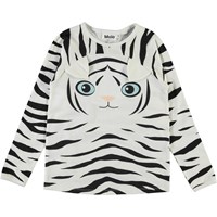Zweigeteiltes nattøjsssæt in Weiß mit Tigerstreifen, sowie Augen und Ohren auf dem Pullover. Die Hose hat Bindeband an der Taille und der Pullover hat lange Ärmel. Ecocert Greenlife, certifikationsnr. 197496