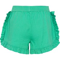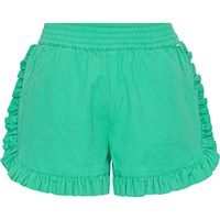 Grüne Baumwollshorts mit Rüschendetails. Die Shorts haben einen breiten elastischen Bund, Vordertaschen und eine lockere Passform.
