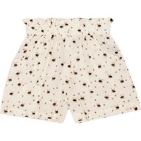 Cremeweiße Leinenshorts aus Öko-Baumwolle. Die Shorts haben einen Knopf- und Reißverschluss, Vordertaschen und aufgenähte Gesäßtaschen. Die Taille ist elastisch und hat rundum einen kleinen Rüschenrand. Die Shorts haben einen Allover-Print aus kleinen Blumen und Kolibris.