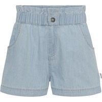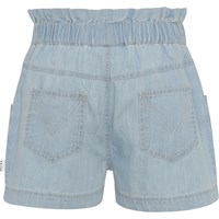 Adara ist eine hellblaue Jeansshorts mit hellen Nähten. Die Shorts sind hoch tailliert mit einer schönen Rüschenkante oben.