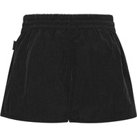 Schwarze sportliche Nylon-Shorts. Die Shorts haben ein weißes, gesticktes Kleeblatt-Logo, Seitentaschen und einen breiten elastischen Bund mit Kordelzügen, die das Anziehen erleichtern und ein angenehmes Tragegefühl ermöglichen. Die Shorts eignen sich zum Nasswerden, da das dünne Nylon schnell trocknet.