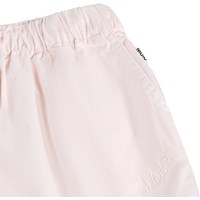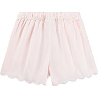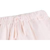 Rosa, lockere Shorts aus Bio-Baumwolle. Die Shorts haben dekorative wellige Kanten, feine Stickereidetails, Seitentaschen, einen elastischen Bund mit Kordelzug und eine weite Passform.