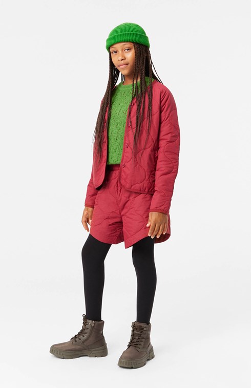 Bordeaux gesteppte Shorts mit seitlichen Taschen und einem elastischen Bund. Die Shorts haben ein schönes Muster im gesteppten Material. Kombinieren Sie sie mit einer passenden Jacke aus demselben Material, um das Set zu vervollständigen.