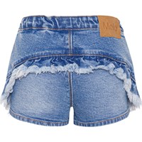 Blaue Denimshorts mit Rüschendetails vorne und hinten. Die Shorts haben eine gute Passform, einen Knopf- und Reißverschluss und können mit einem innenliegenden Knopf im Bund angepasst werden. Die Shorts haben vorn ungesäumte Rüschen, die sich bis zum hinteren Teil fortsetzen.
