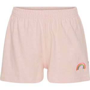 Akima ist eine rosa Shorts mit Gummizug aus 100 % Baumwolle. Die Shorts haben einen elastischen Bund und eine Regenbogenstickerei unten am Oberschenkel.