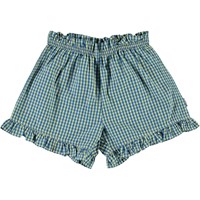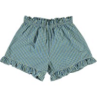 Alandra sind ein Paar blau karierten Shorts mit einer kleinen Rüschenkante unten an den Beinen und einer elastischen Taille. Kombiniere die Shorts mit einem passenden Top für ein cooles Sommer-Outfit.
