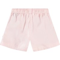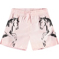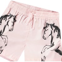 Rosa Öko-Baumwoll-Popeline-Shorts mit einem zarten Druck von handgezeichneten Pferden. Diese Shorts haben einen Kordelzugverschluss und eine lockere Passform.