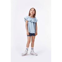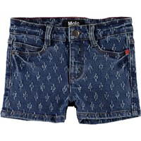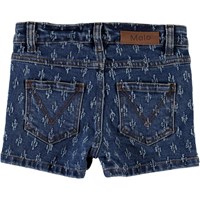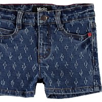 Alisha sind ein Paar Denim-Shorts mit feinem Lochmuster. Die Shorts haben Gürtelschlaufen und Taschen vorne und hinten.