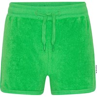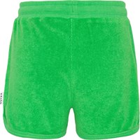 Grüne sportliche Shorts aus weichem Baumwollfrottee. Die Shorts haben farblich passende Einfassungen, einen breiten elastischen Bund mit Schnürung, die das Anziehen und den Tragekomfort erleichtern. Baumwollfrottee ist angenehm zu tragen und trocknet nach dem Schwimmen schnell.