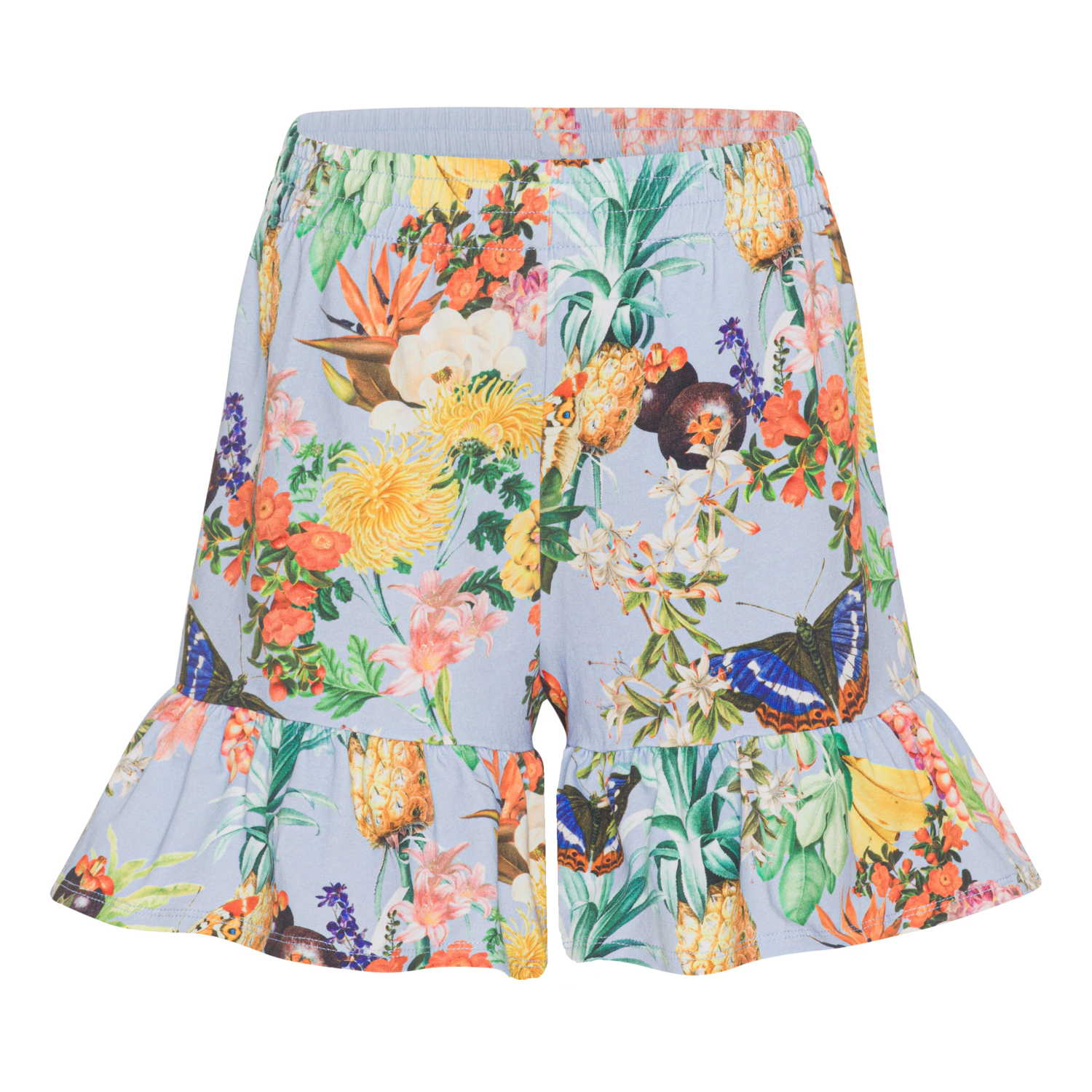 Almira ist ein Paar Shorts mit breiten Rüschen unten. Die Shorts haben einen elastischen Bund und sind rundum bedruckt, Tropical Fruits, mit Ranken aus tropischen Früchten, tropischen Blumen und Schmetterlingen.