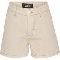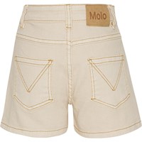 Alvira ist eine cremefarbene Denim-Shorts mit goldenen Nähten. Die Shorts haben Gürtelschlaufen, Taschen vorne und hinten und schließen mit Knopf und Reißverschluss.