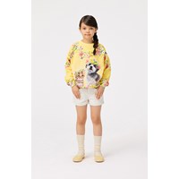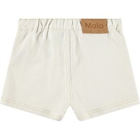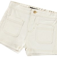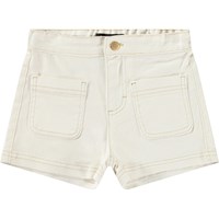 Weiße Jeansshorts mit gestickten Taschen vorne. Die Shorts haben einen Druckknopf- und Reißverschluss sowie einen elastischen Bund hinten, der das Anziehen erleichtert und für eine gute Passform sorgt.