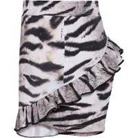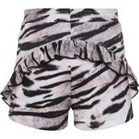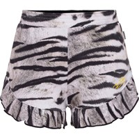 Amma ist eine Shorts aus Öko-Baumwolle mit schwarz-weißem Tiger-Print sowie elastischem Bund und dekorativer Rüschenkante im Beinabschluss, die sich auf der Rückseite fortsetzt. Unten an einer Beinöffnung befindet sich ein aufgedrucktes gelbes Panthera-Logo.
