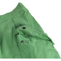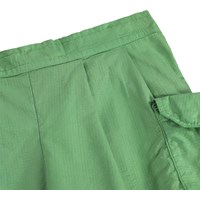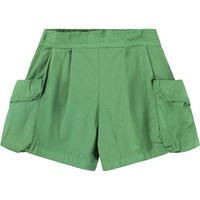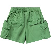 Grüne Shorts aus Bio-Baumwolle mit leichter Textur, die einen stilvollen und entspannten Look bieten. Sie haben geräumige Cargotaschen an den Oberschenkeln und breite Falten an der Vorderseite. Der Bund ist vorne fest und hinten elastisch, was einen bequemen Sitz bietet und das An- und Ausziehen erleichtert.