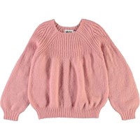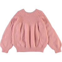 Gabriela ist eine rosa Strick-Pullover mit einem Strickmuster oben. Der Pullover hat ein schönes Volumen.