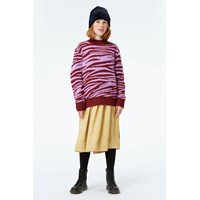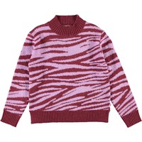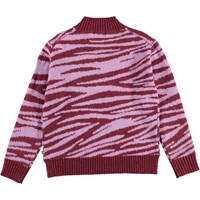 Gady ist eine dunkelrote Strickbluse mit lila Zebrastreifen. Die Bluse hat einen hohen Hals mit rundem Ausschnitt.