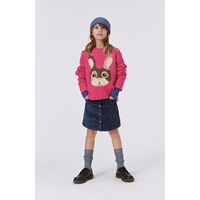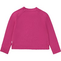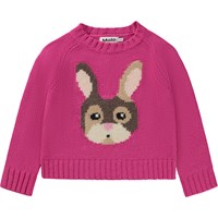 Pinkfarbener Strickpullover mit Kaninchenmuster. Dieser Strickpullover ist aus einer weichen Woll/Acryl-Mischung gefertigt, hat ein niedlichen Kaninchen auf der Vorderseite, einen Rundhalsausschnitt mit Rippbündchen, einen Raglanschnitt, lange Ärmel mit Rippbündchen, Rippbündchen an der Hüfte und eine lockere Passform. Perfekte Strickware für die etwas kälteren Tage.