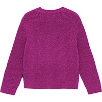 Rosa gestrickter Pullover aus einer weichen Wollmischung. Der Pullover hat einen Rundhalsausschnitt und gerippte Bündchen an den Ärmeln, am Ausschnitt und am Bund. Er ist angenehm warm und hat eine normale Passform, die genug Platz bietet, um ein Langarm-T-Shirt darunter zu tragen.