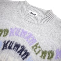 Grauer, übergroßer Pullover aus Wolle mit einem mehrfarbigen Muster, in das der Text ''Humankind'' eingewebt ist. Er hat eine lockere Passform und gerippte Abschlüsse am Hals, an den Ärmeln und am Saum.