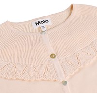Hellrosa Strickjacke aus weicher, biologischer Baumwolle mit einer schönen Passe. Die Strickjacke hat eine klassische Passform mit Knöpfen vorne und leicht gepufften Ärmeln mit gerippten Kanten, die einen eleganten Balloneffekt erzeugen.
