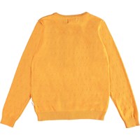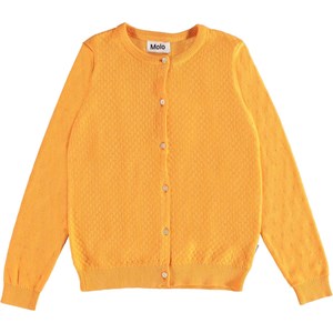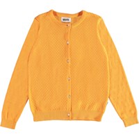 Georgina ist ein orangefarbener Baumwoll-Cardigan. Der Cardigan ist im Feinstrickmuster und mit Knopfverschluss.
