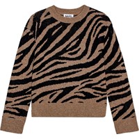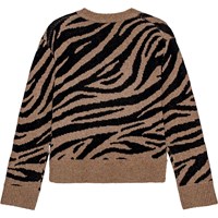 Gestreifter Wollpullover in Schwarz und Braun. Der Pullover hat einen Rundhalsausschnitt, eine lockere Passform und an jeder Seitennaht einen kleinen Schlitz.
