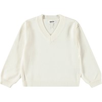 Weicher weißer Strickpullover aus Baumwolle mit V-Ausschnitt und gerippten Kanten am Hals, an den Ärmeln und am unteren Saum des Pullovers. Der Pullover hat eine lockere Passform, was ihn angenehm zu tragen macht.