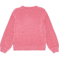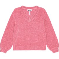 Weicher rosa gestrickter Pullover mit V-Ausschnitt. Der Pullover hat gestrickte gerippte Kanten am Ausschnitt, an den Ärmeln und am Saum. Er hat eine lockere Passform, was ihn angenehm zu tragen macht.